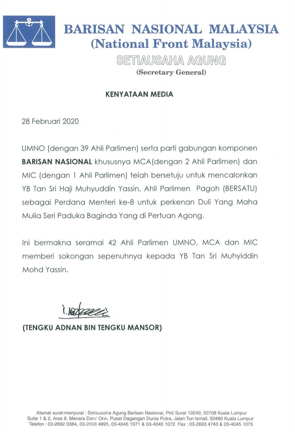 Afiezy Azaman Awani On Twitter Baru Diterima Kenyataan Susulan Barisan Nasional Umno Mca Mic Bersetuju Calonkan Tan Sri Muhyiddin Yassin Sebagai Perdana Menteri Ke 8 Ahli Parlimen Barisan Nasional 42 Ahli Parlimen Pas 18