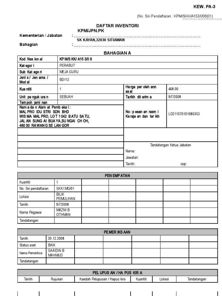 Kew Pa 1 Borang Laporan Penerimaan Aset Alih Kerajaan
