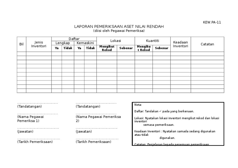 Borang kew pa 11. Nombor siri pendaftaran. Pa 25 borang sebutharga pelupusan aset alih kerajaan nama individu syarikat. Borang kew pa 21 32 carta organisasi urabp 2017 baru pages. Kew pa 11 laporan pemeriksaan inventori diisi oleh pegawai pemeriksa daftar lengkap kemaskini lokasi kuantiti bil jenis inventori yatidakyatidak mengikut rekod sebenar mengikut rekod sebenar.