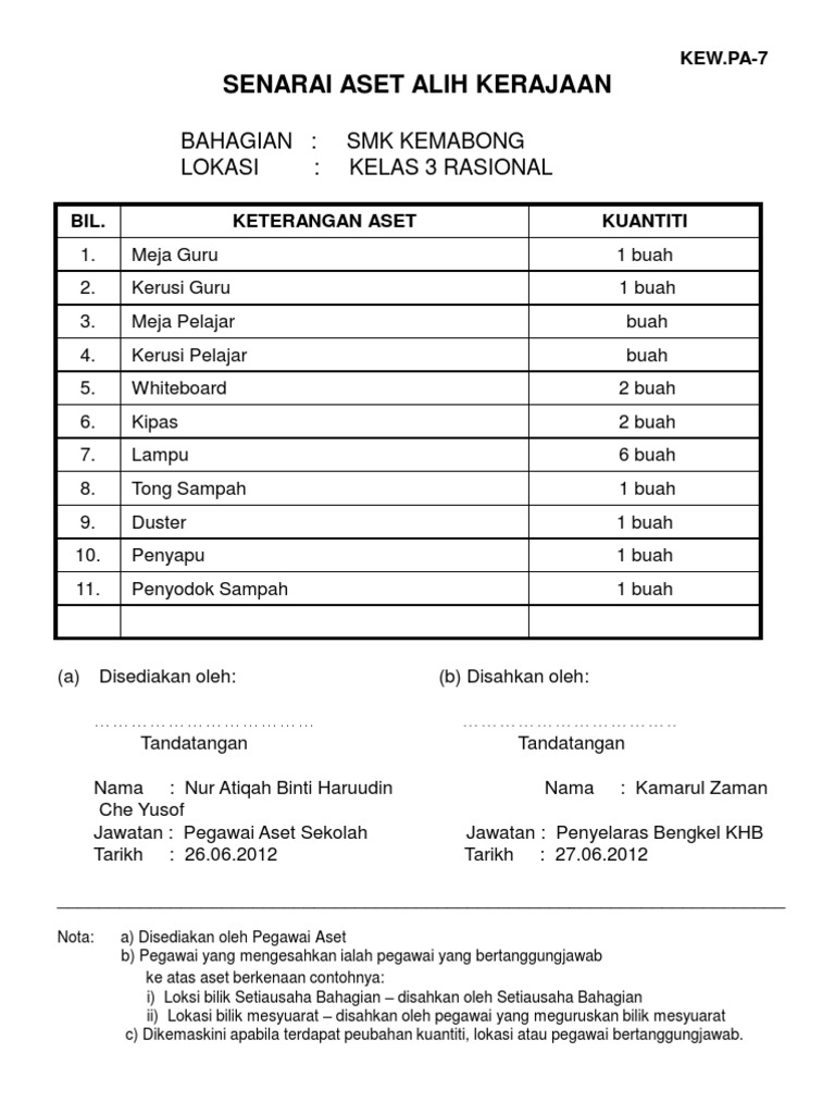 7 Kew Pa 7 Senarai Aset Di Lokasi Kelas 2i Doc Kew Pa 7 Senarai Aset Alih Kerajaan Bahagian Smk Asyakirin Bintulu Lokasi Kelas 21 Bil Keterangan Aset Course Hero