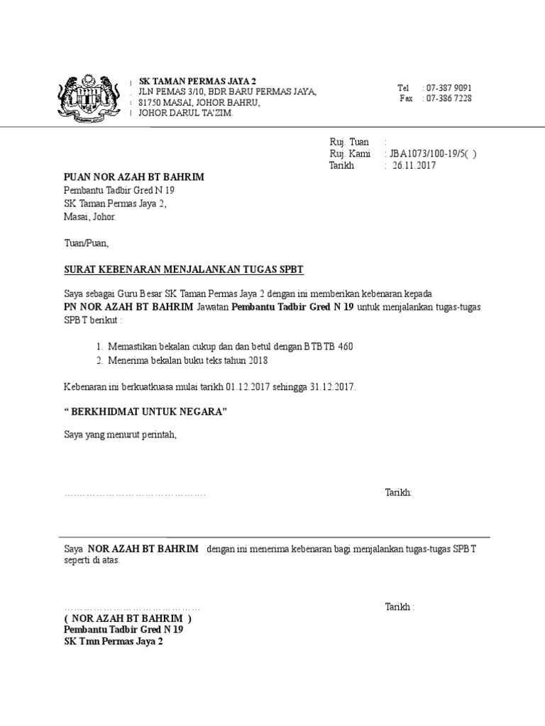 Contoh Surat Turun Kuasa Spbt Sekolah Rendah