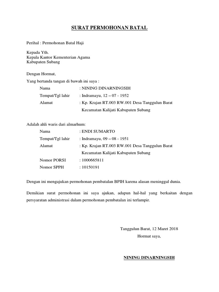 Contoh Surat Pembatalan Haji Karena Meninggal Doc Kumpulan Surat Penting