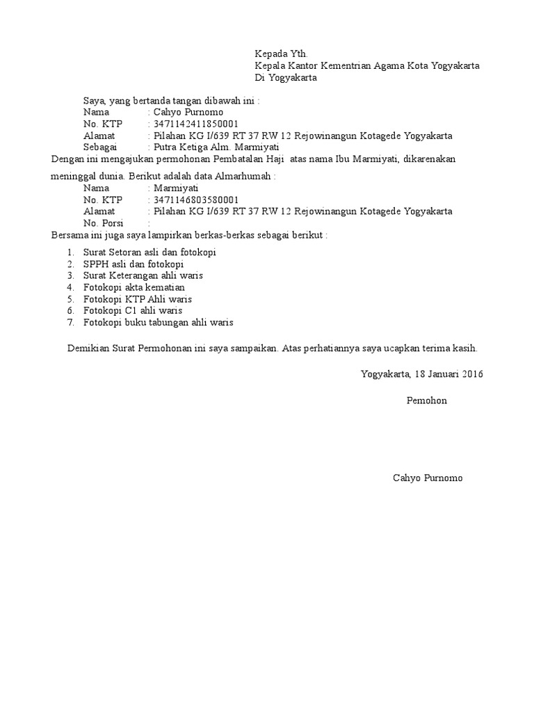 Surat Permohonan Pembatalan Haji Dari Ahli Waris Resepi Book M