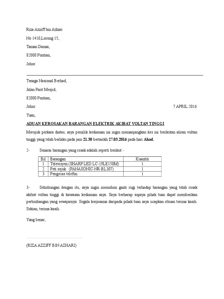 Bahasa Melayu Contoh Surat Tuntutan Ganti Rugi Kerosakan