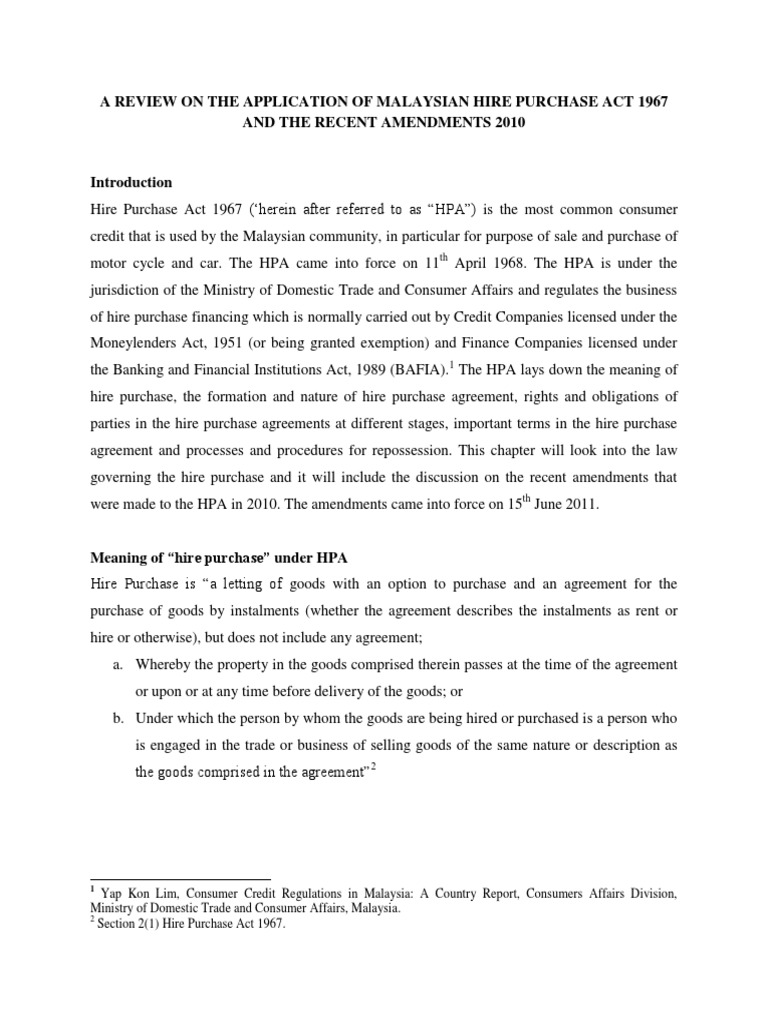 A Review On The Application Of Malaysian Hire Purchase Act 1967 And The Recent Amendments 2010 Repossession Credit