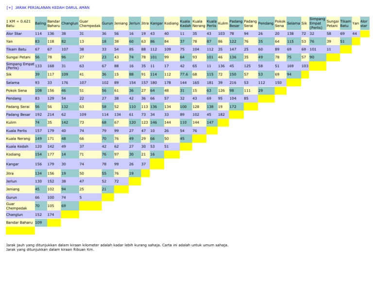 Jadual Jarak Perjalanan Dalam Kilometer Di Malaysia