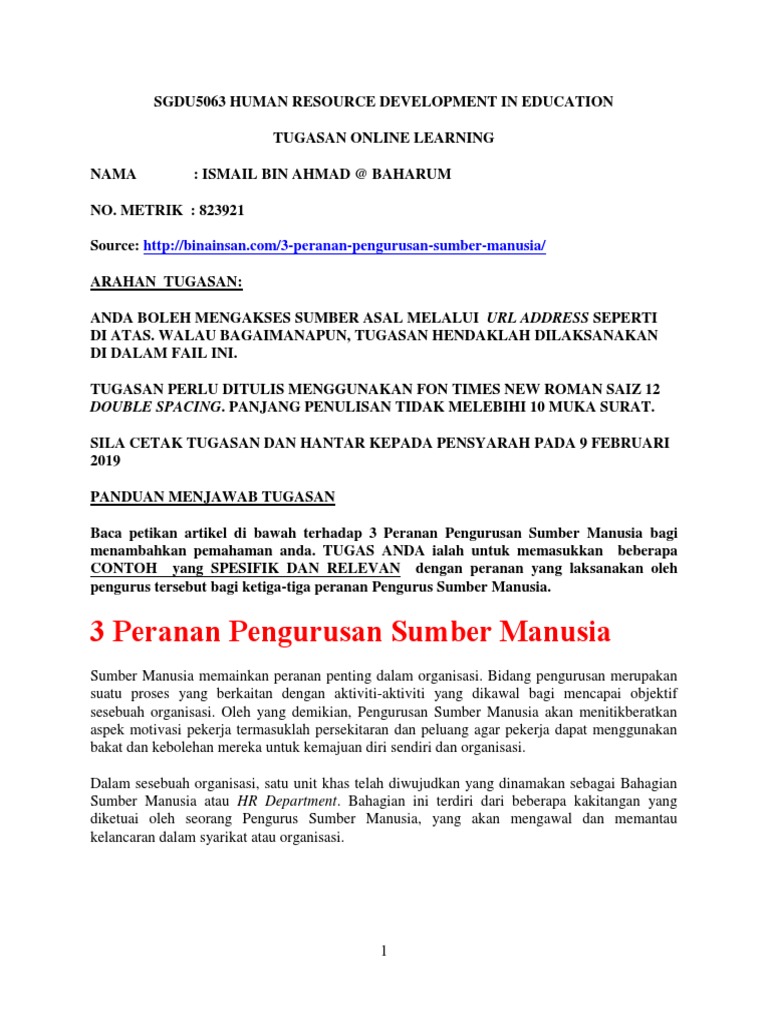 Online Learning 1 Peranan Pengurusan Sumber Manusia
