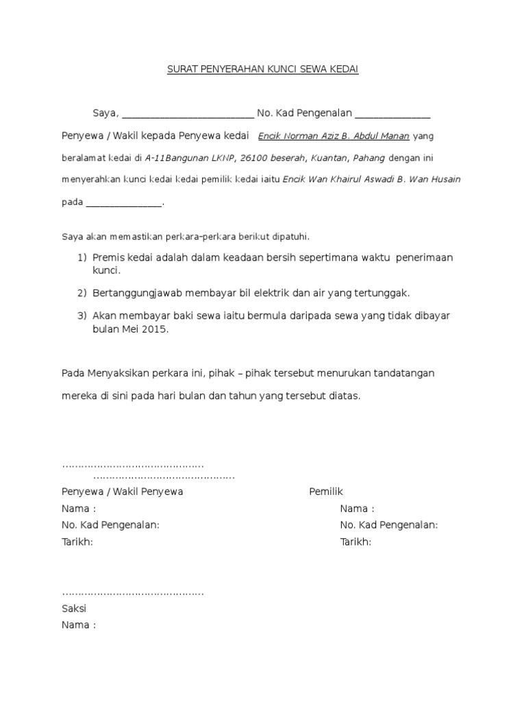 Surat Penyerahan Kunci Sewa Kedai